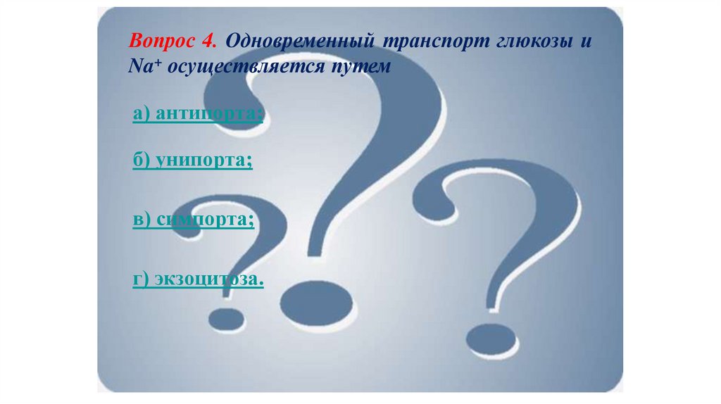 Вопрос 4. Одновременный транспорт глюкозы иNa+ осуществляется путем