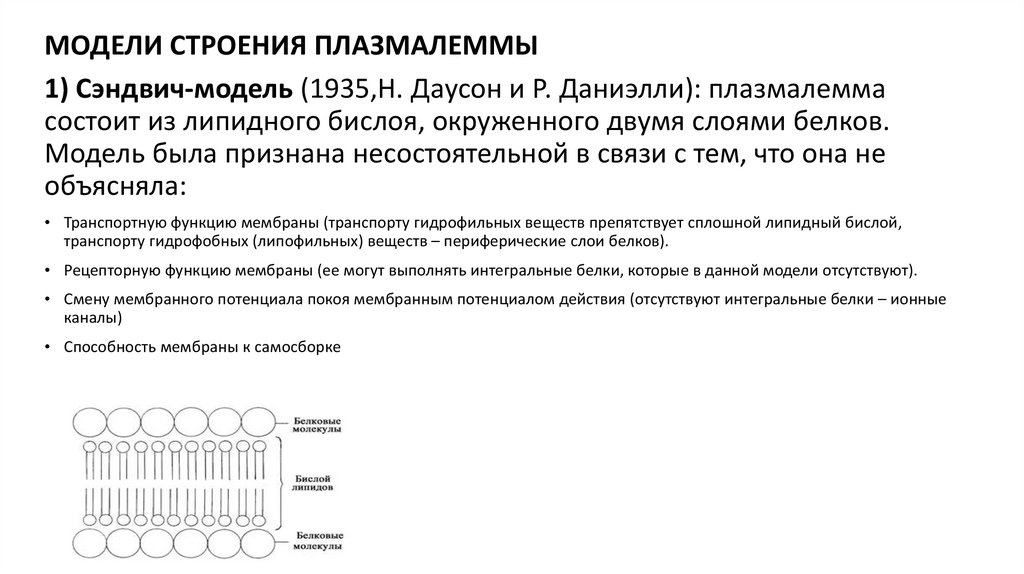 МОДЕЛИ СТРОЕНИЯ ПЛАЗМАЛЕММЫ1) Сэндвич-модель (1935,Н. Даусон и Р. Даниэлли): плазмалемма
