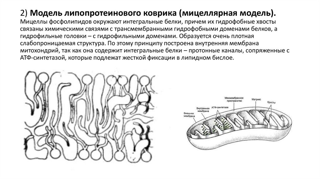 2) Модель липопротеинового коврика (мицеллярная модель).Мицеллы фосфолипидов окружают интегральные белки, причем их гидрофобные хвосты