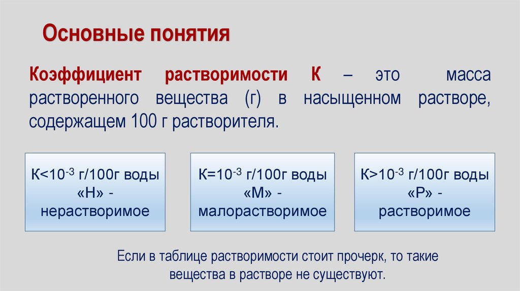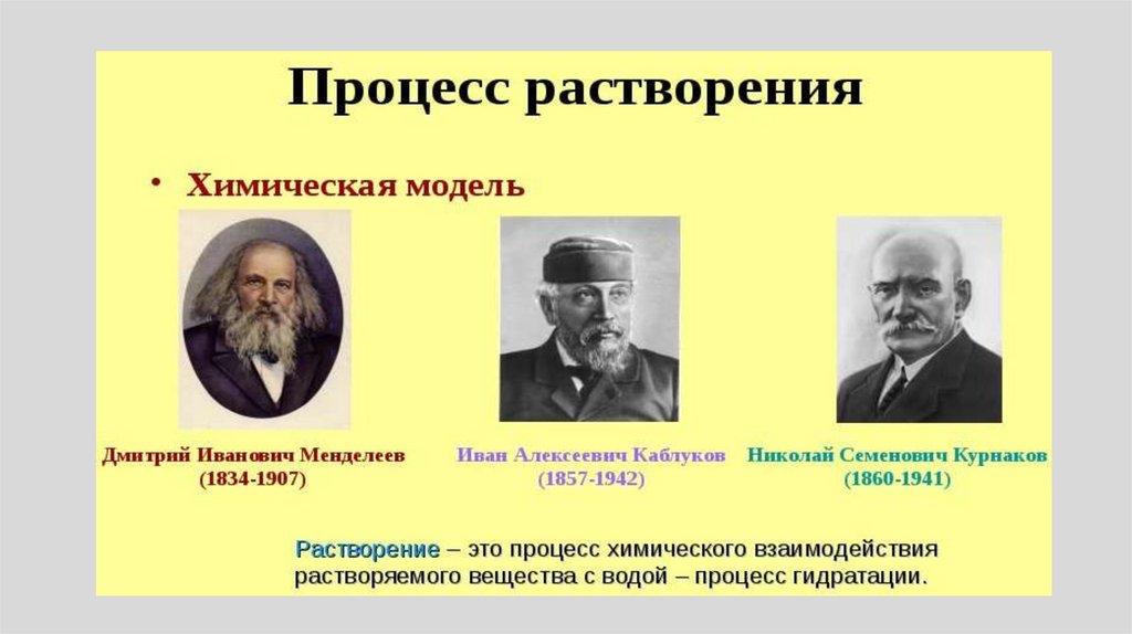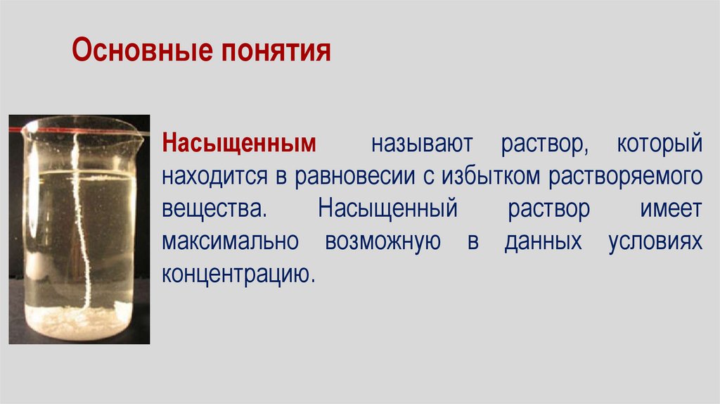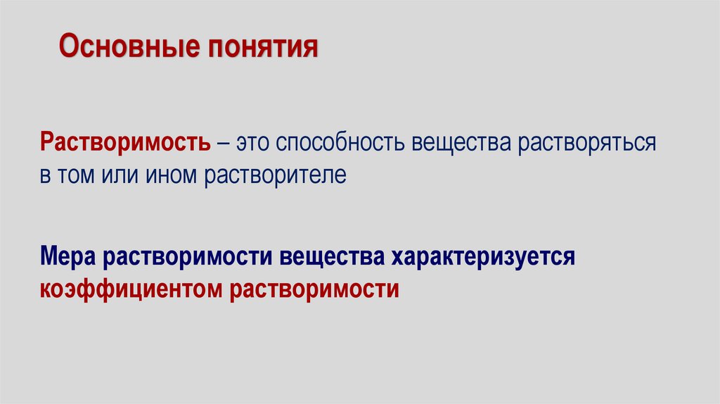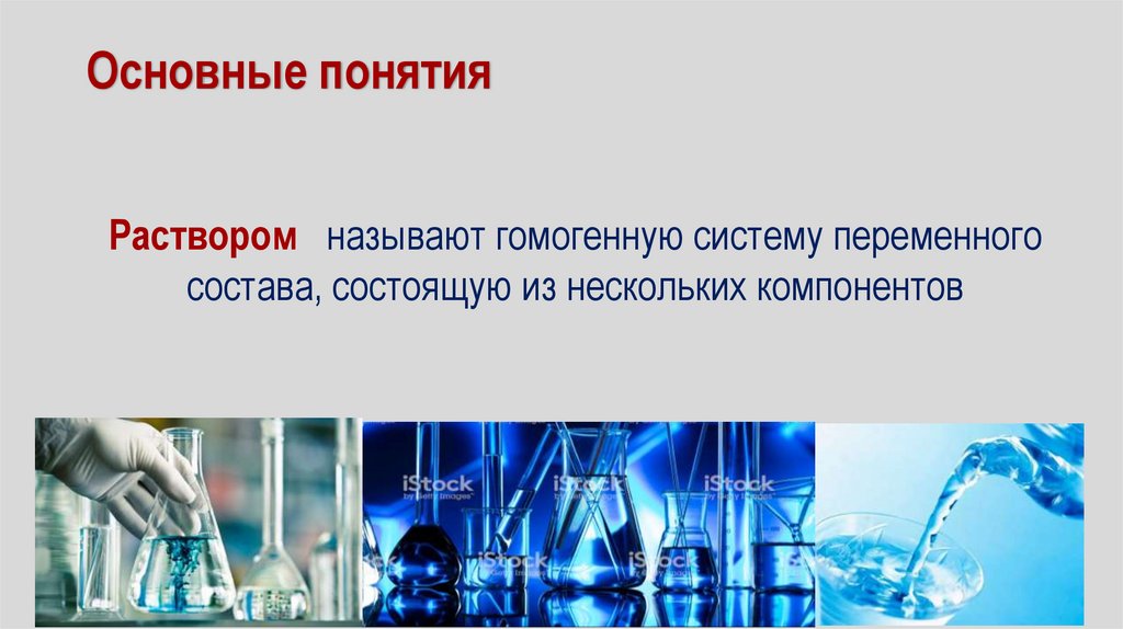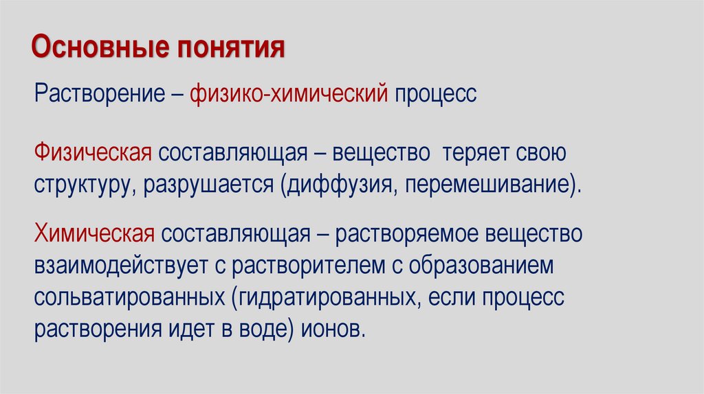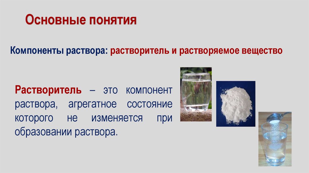 Основные понятияКомпоненты раствора: растворитель и растворяемое вещество
