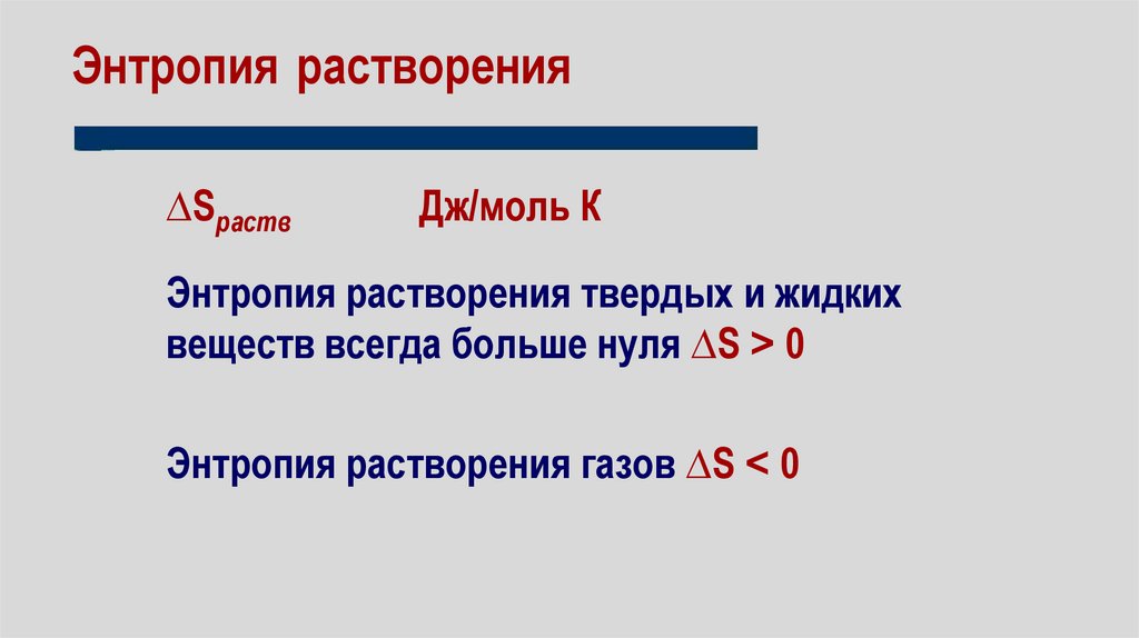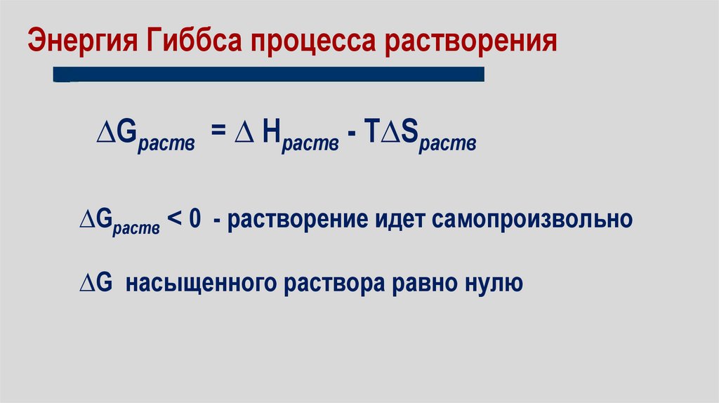 Энергия Гиббса процесса растворения∆Gраств = ∆ Hраств - T∆Sраств