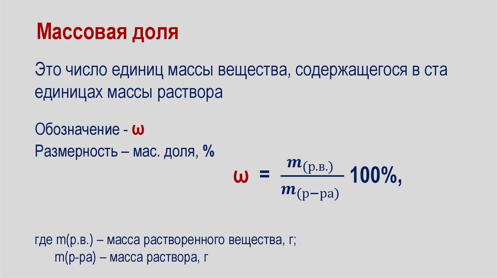 Массовая доляЭто число единиц массы вещества, содержащегося в ста