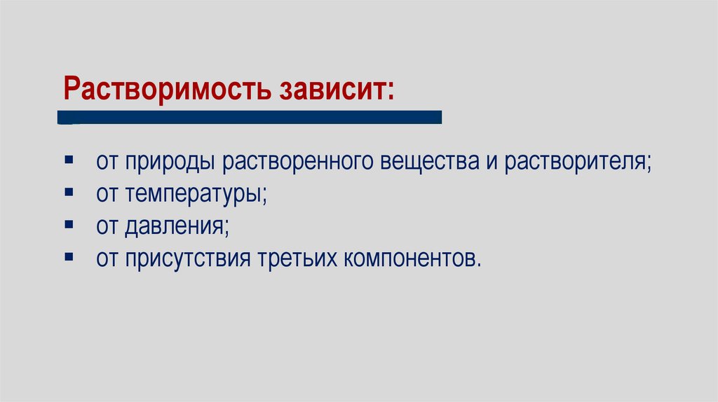 Растворимость зависит:от природы растворенного вещества и растворителя;