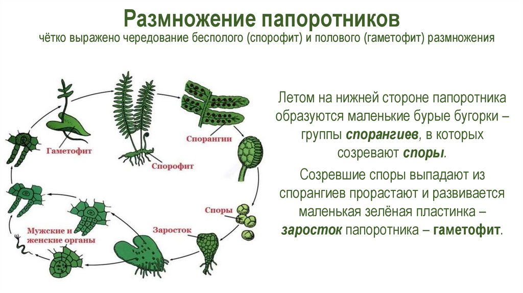 Размножение папоротниковчётко выражено чередование бесполого (спорофит) и полового (гаметофит) размножения