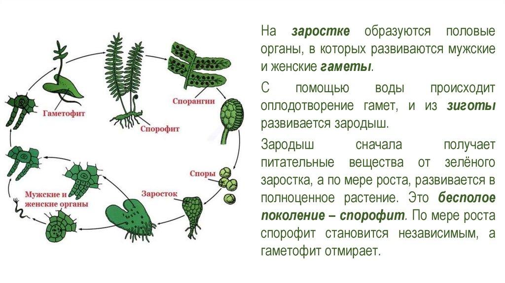 На заростке образуются половыеорганы, в которых развиваются мужские