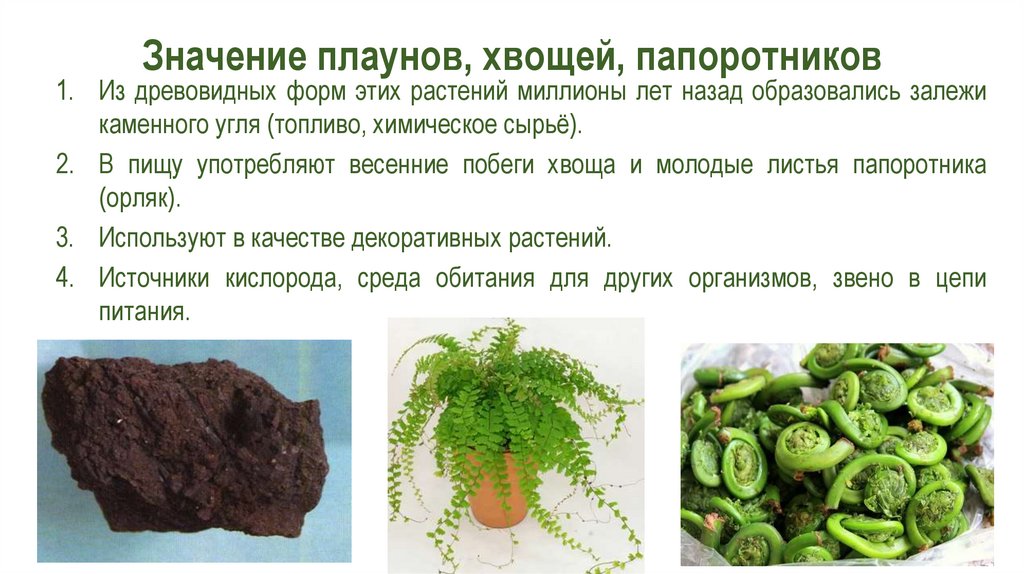 Значение плаунов, хвощей, папоротников1. Из древовидных форм этих растений миллионы лет назад образовались залежи