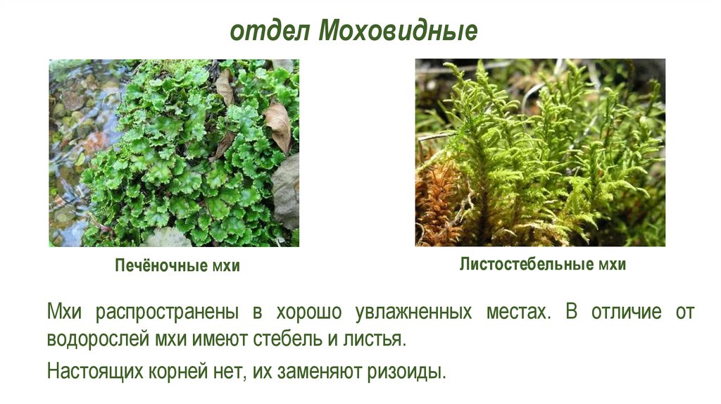 Мхи распространены в хорошо увлажненных местах. В отличие от