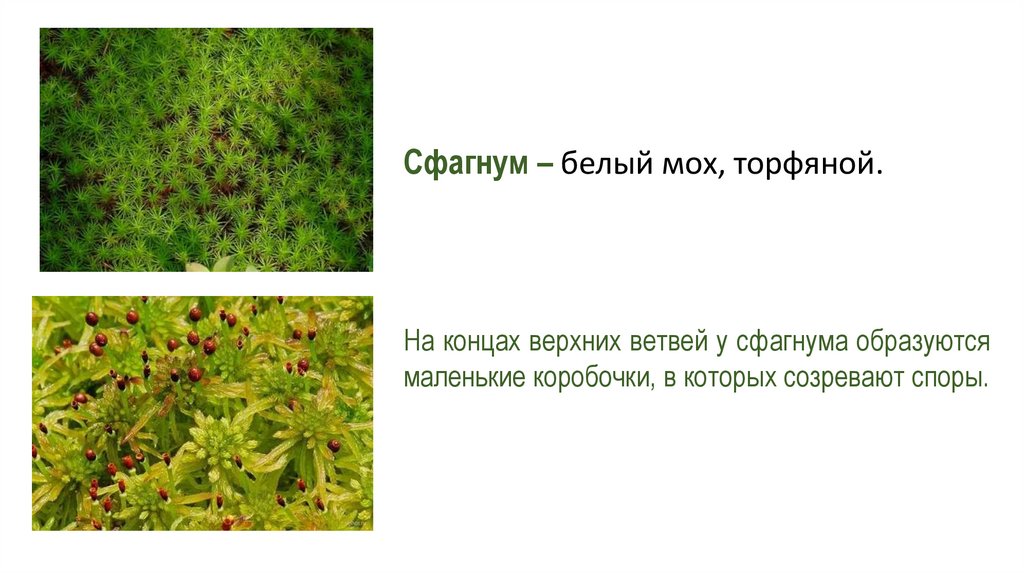 Сфагнум – белый мох, торфяной.На концах верхних ветвей у сфагнума образуются