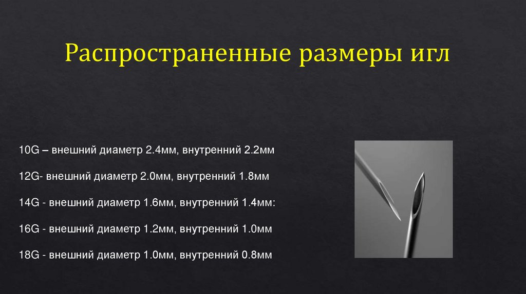 Распространенные размеры игл10G – внешний диаметр 2.4мм, внутренний 2.2мм