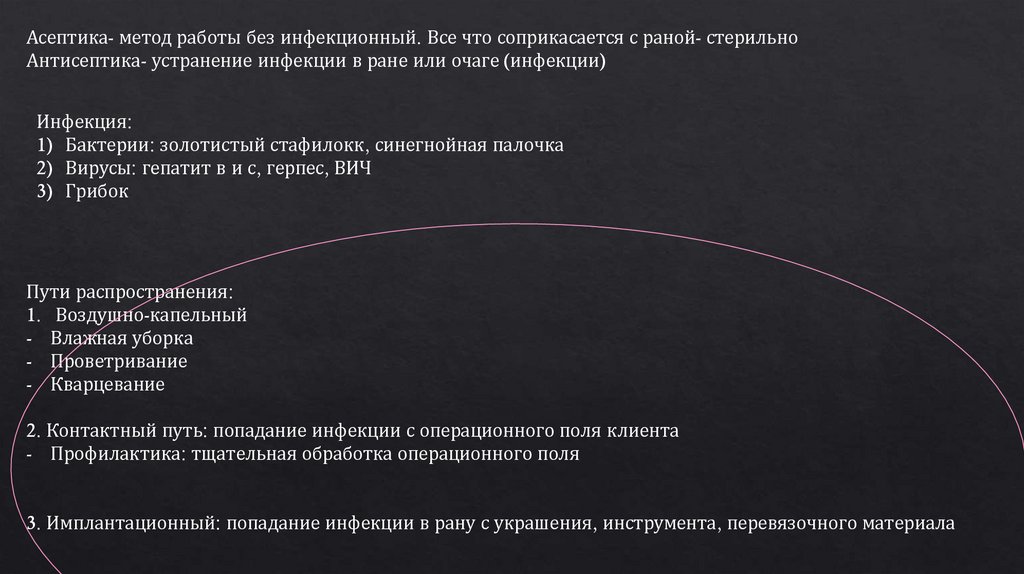 Асептика- метод работы без инфекционный. Все что соприкасается с раной- стерильноАнтисептика- устранение инфекции в ране или очаге (инфекции)