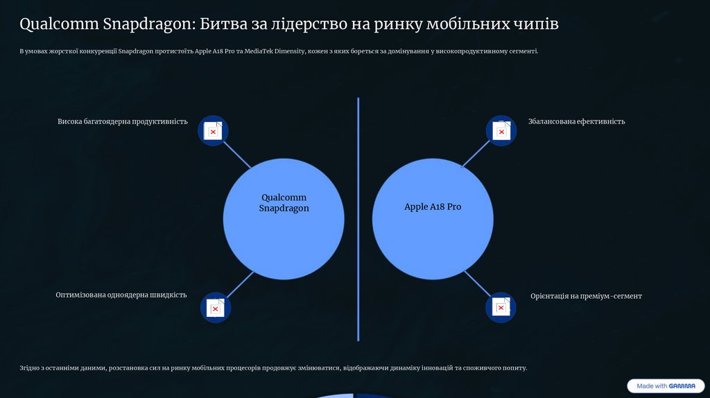 Qualcomm Snapdragon: Битва за лідерство на ринку мобільних чипівВ умовах жорсткої конкуренції Snapdragon протистоїть Apple A18 Pro та MediaTek Dimensity, кожен з яких бореться за домінування у високопродуктивному сегменті.