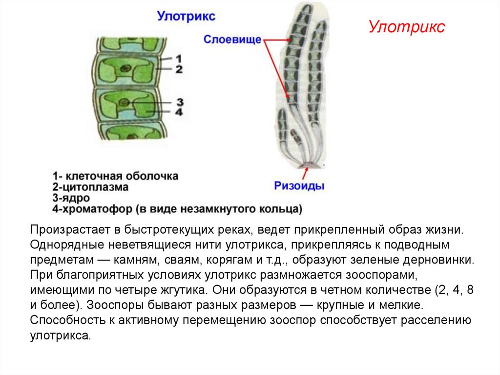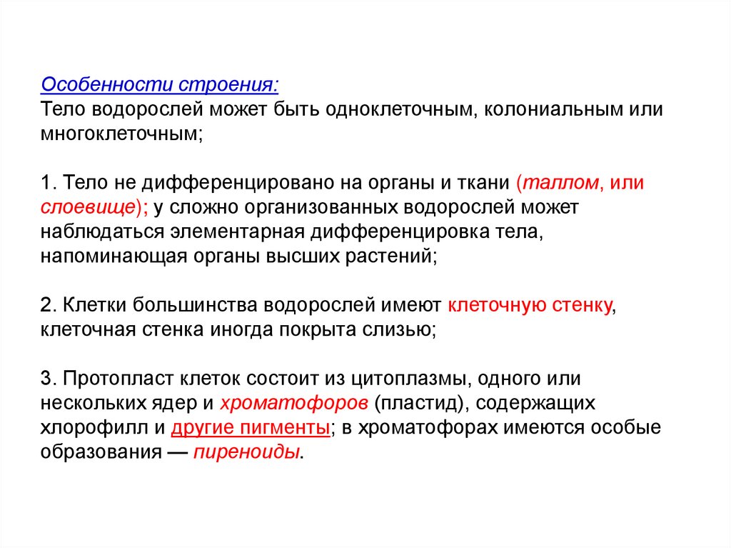 Особенности строения:Тело водорослей может быть одноклеточным, колониальным или