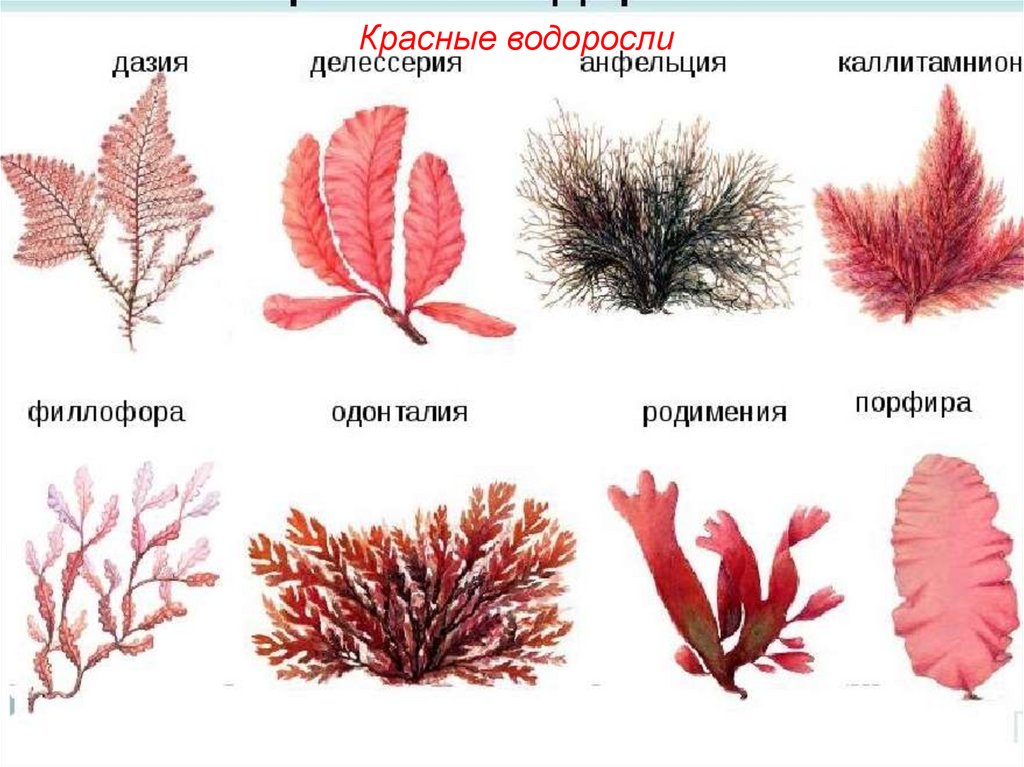 ряд, слева направо: пальмария обманчивая,гигартина, филлофора, полиневра