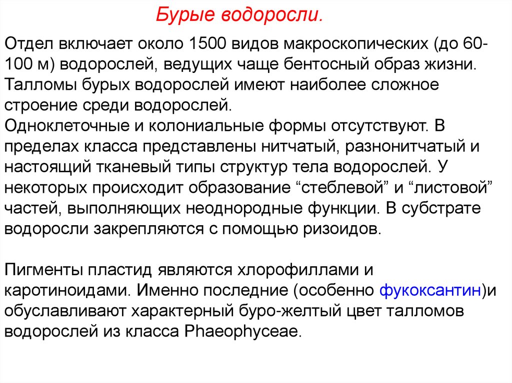 Бурые водоросли.Отдел включает около 1500 видов макроскопических (до 60100 м) водорослей, ведущих чаще бентосный образ жизни.