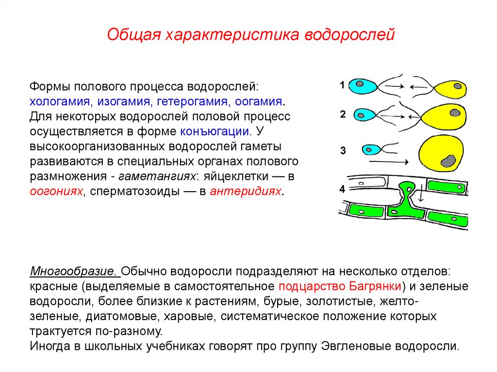 Общая характеристика водорослейФормы полового процесса водорослей: