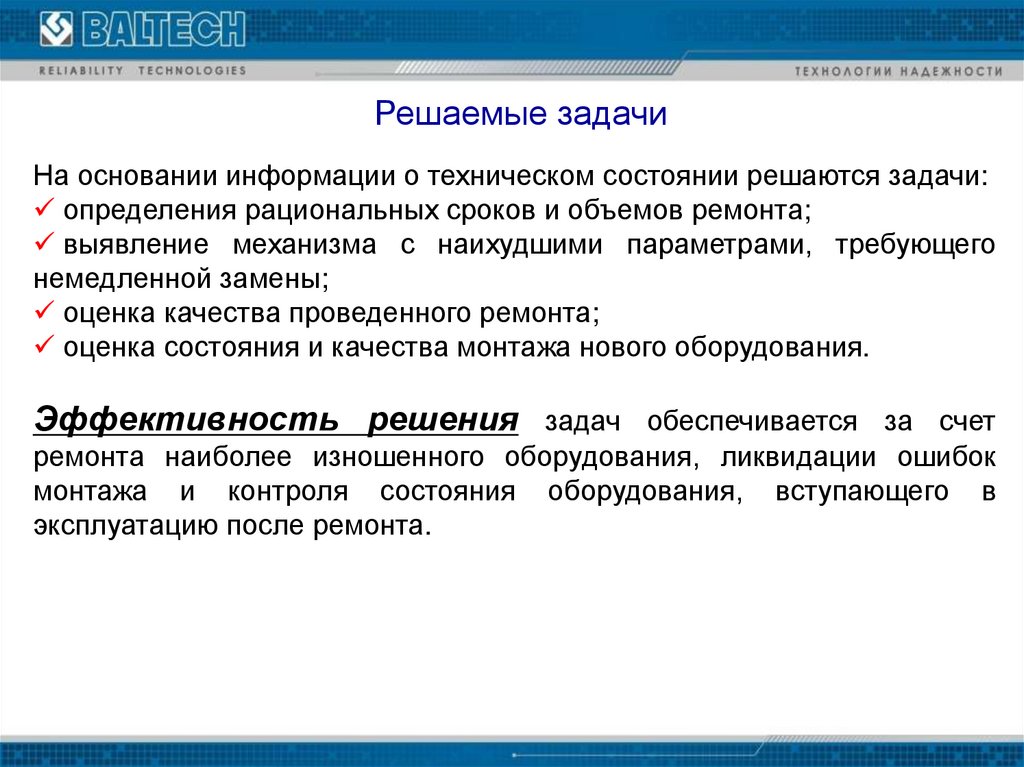 Решаемые задачиНа основании информации о техническом состоянии решаются задачи: