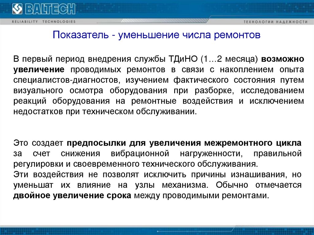 Показатель - уменьшение числа ремонтовВ первый период внедрения службы ТДиНО (1…2 месяца) возможно