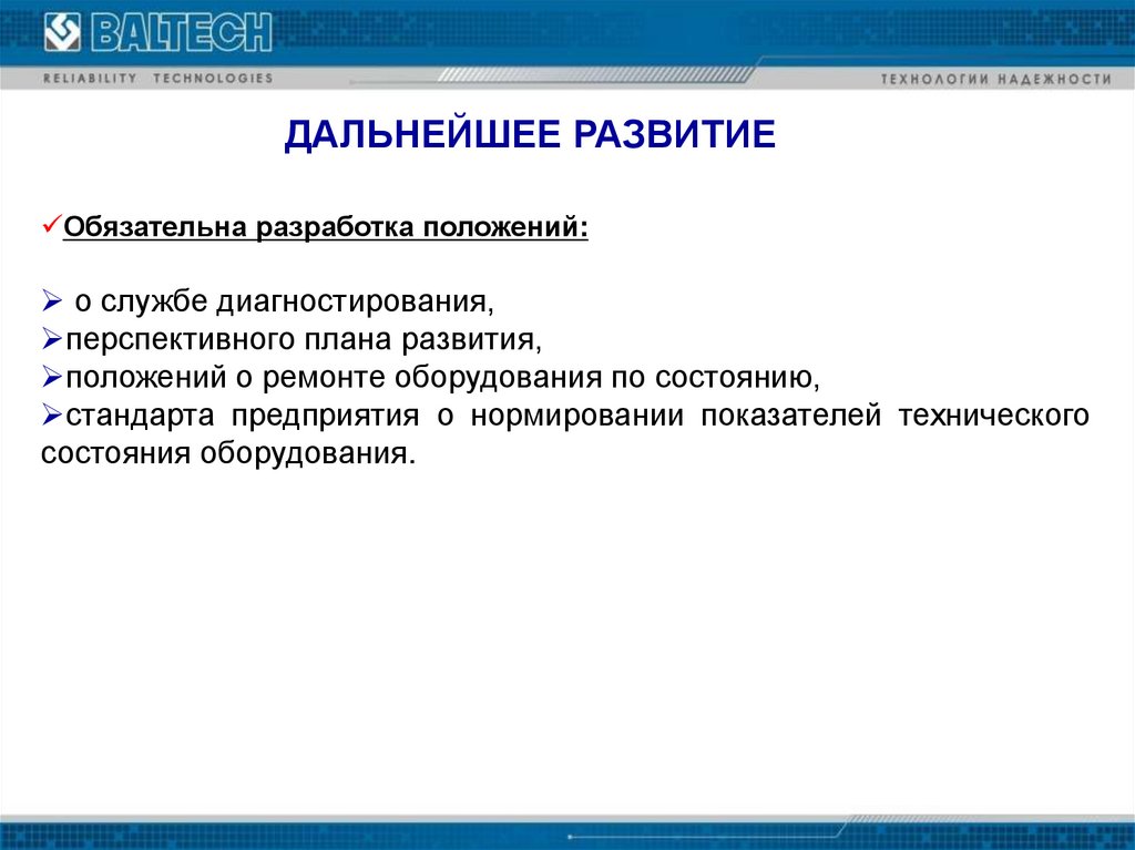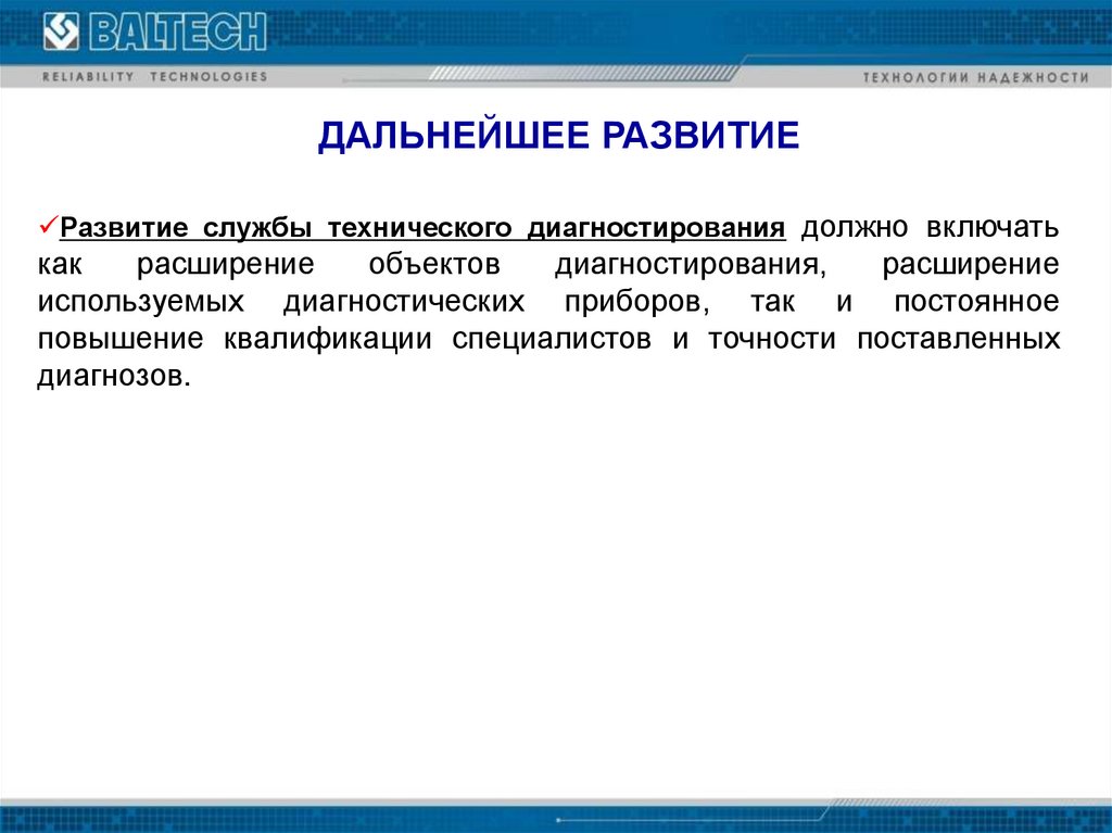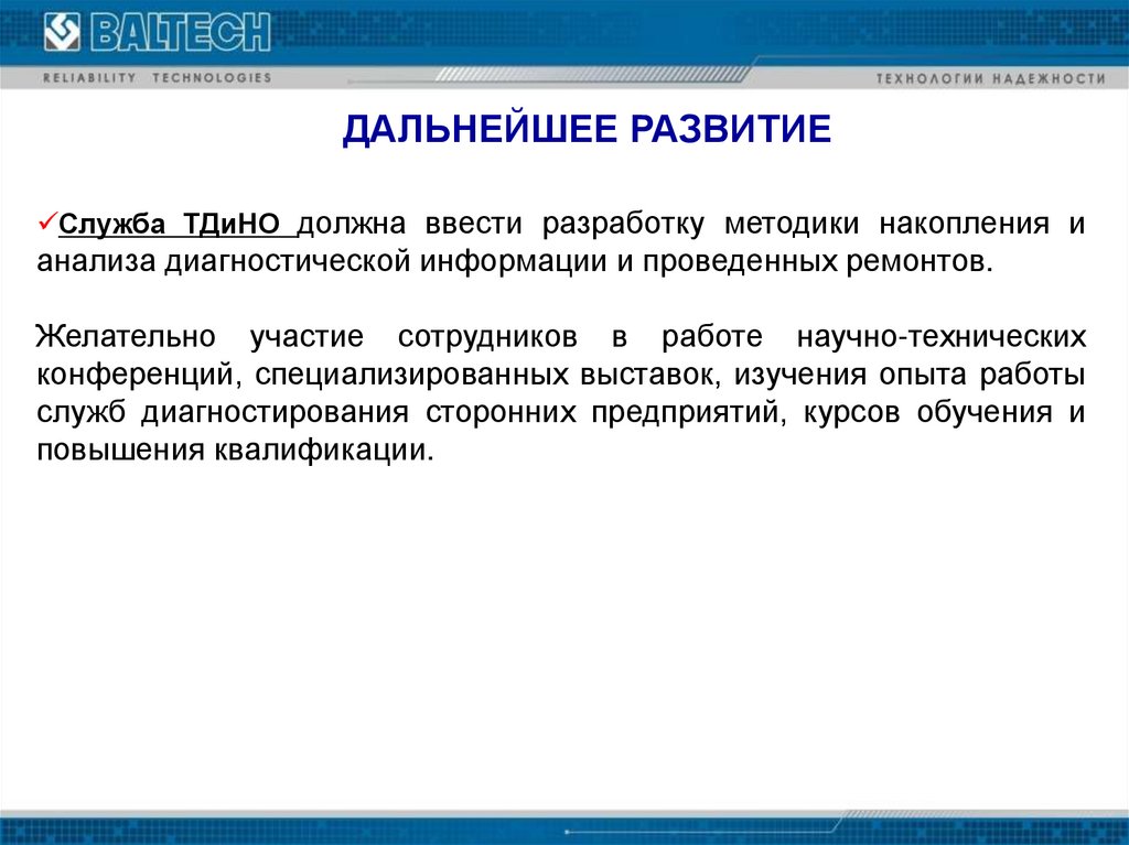 ДАЛЬНЕЙШЕЕ РАЗВИТИЕРазвитие службы технического диагностирования должно включать