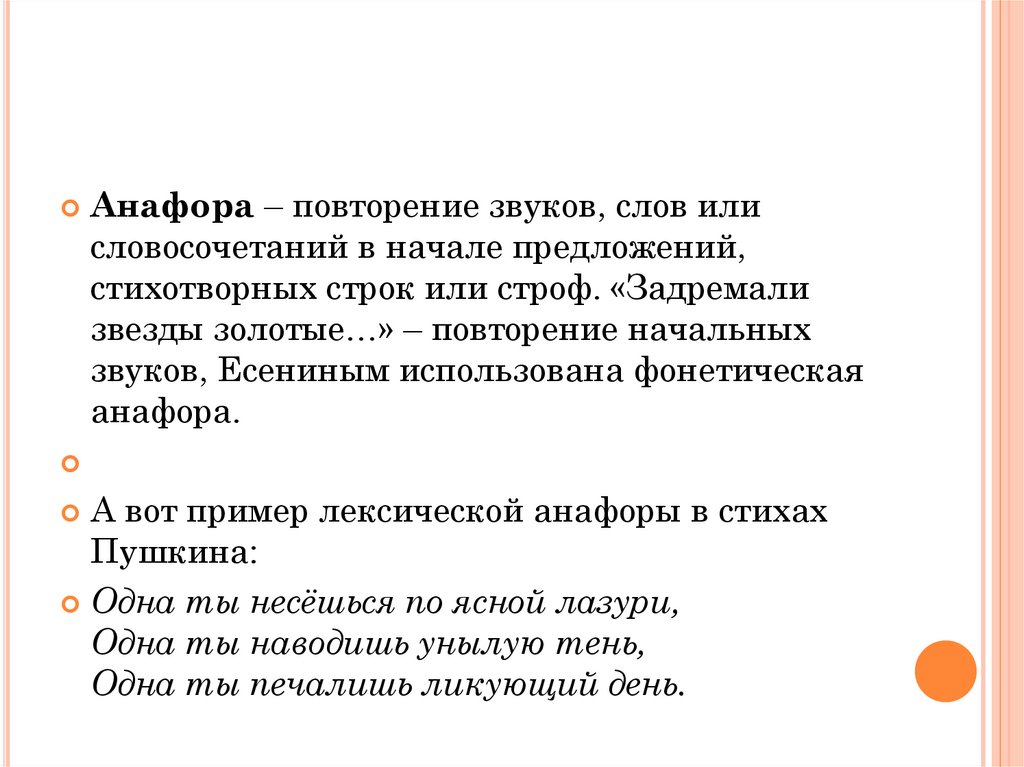 Анафора – повторение звуков, слов илисловосочетаний в начале предложений,