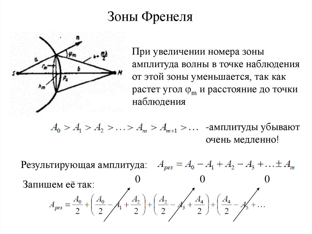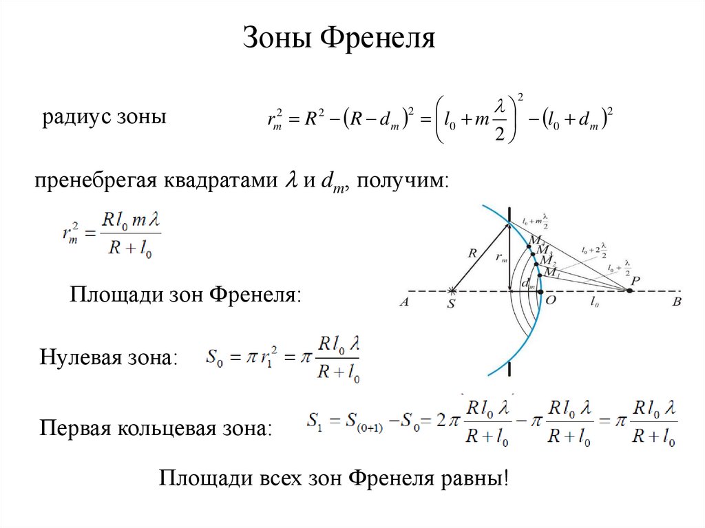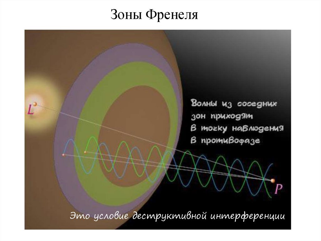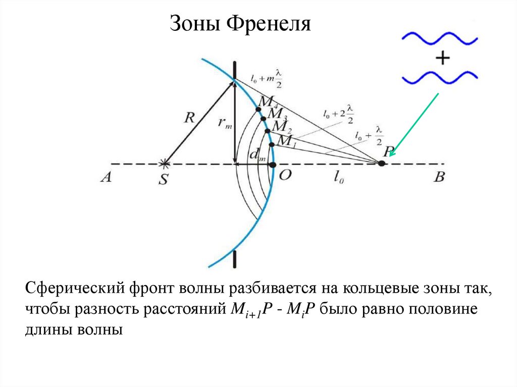 Зоны ФренеляСферический фронт волны разбивается на кольцевые зоны так,