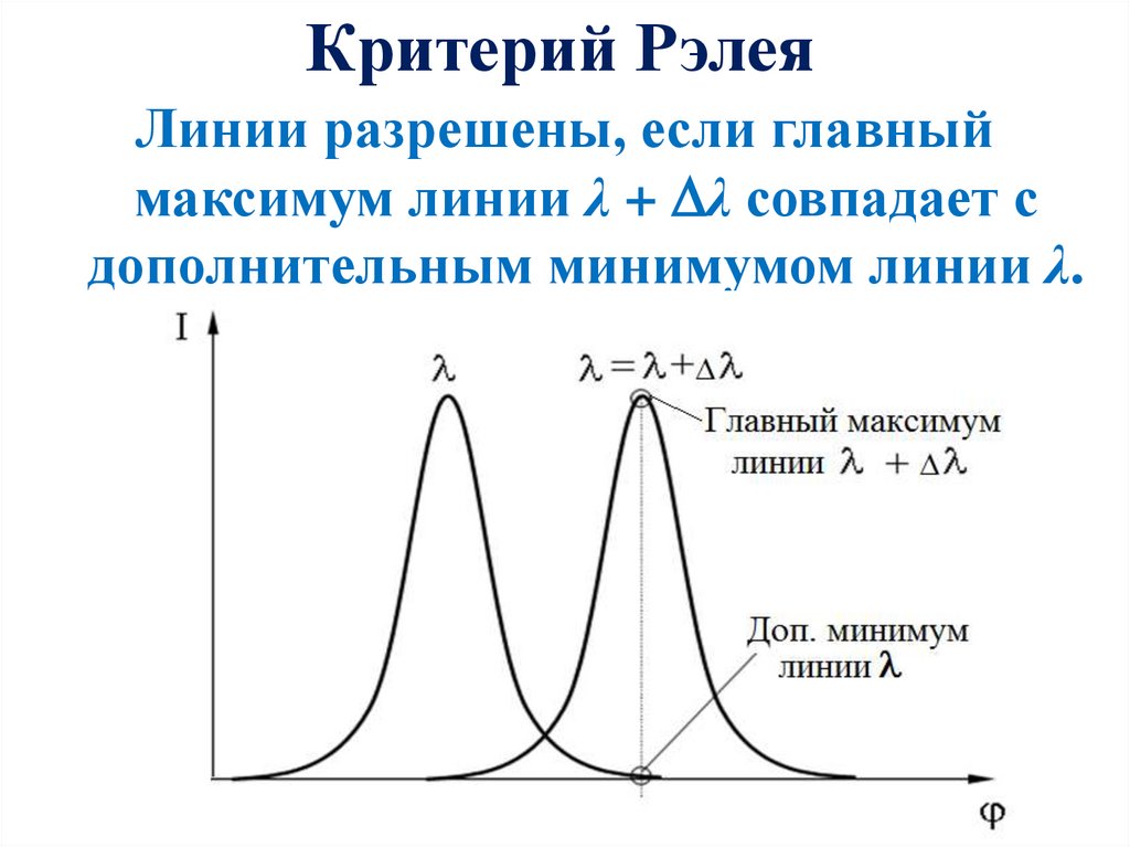 28. Предел разрешения по Релею – это минимальное угловое расстояние между максимумами, которые еще можно различить: