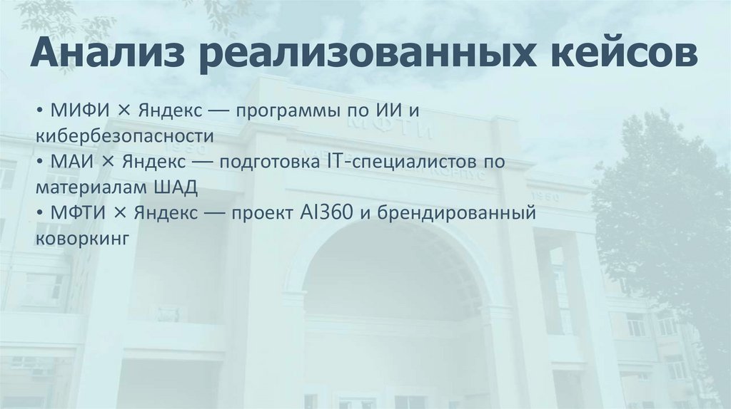 Анализ реализованных кейсов• МИФИ × Яндекс — программы по ИИ и
