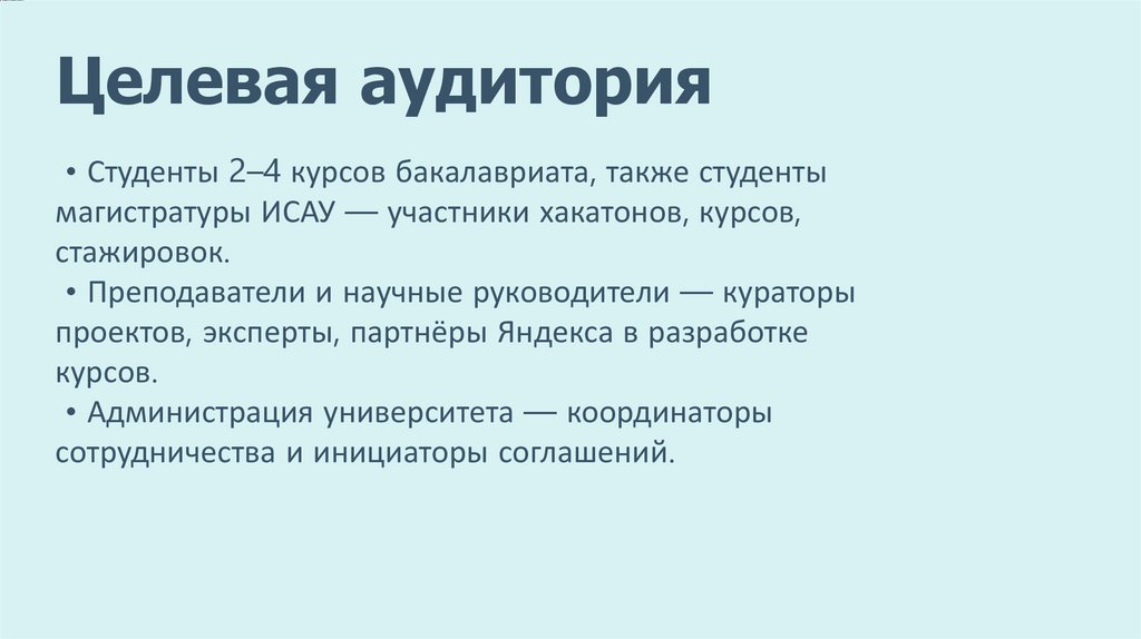 Целевая аудитория• Студенты 2–4 курсов бакалавриата, также студенты
