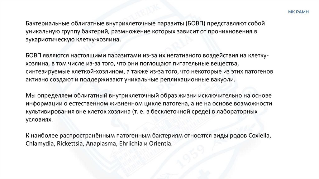 Бактериальные облигатные внутриклеточные паразиты (БОВП) представляют собойуникальную группу бактерий, размножение которых зависит от проникновения в