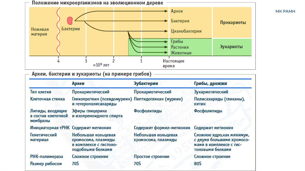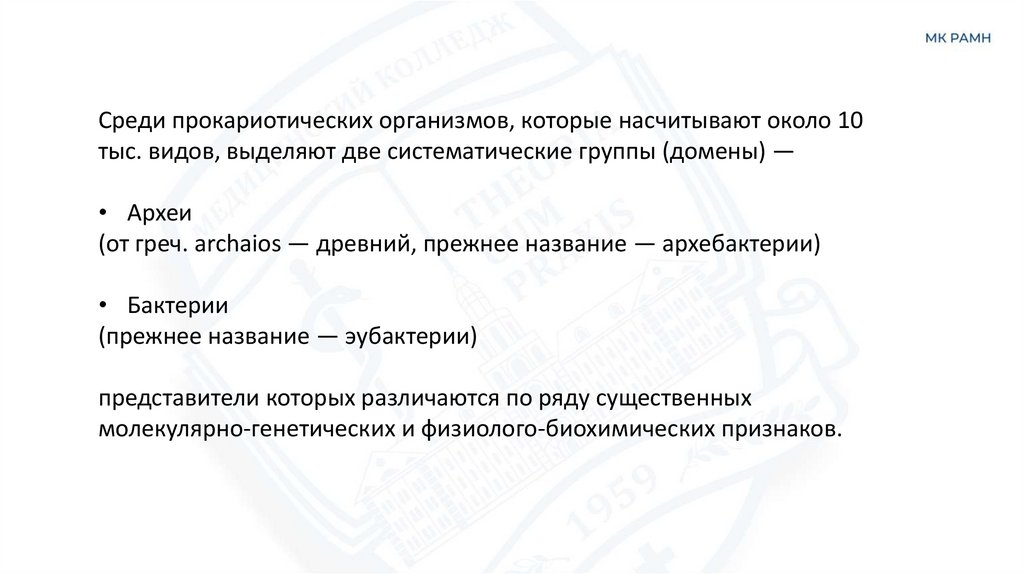 Среди прокариотических организмов, которые насчитывают около 10тыс. видов, выделяют две систематические группы (домены) —