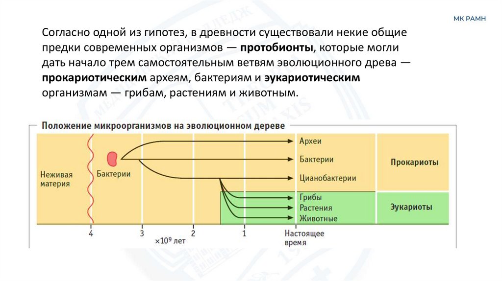 Согласно одной из гипотез, в древности существовали некие общиепредки современных организмов — протобионты, которые могли
