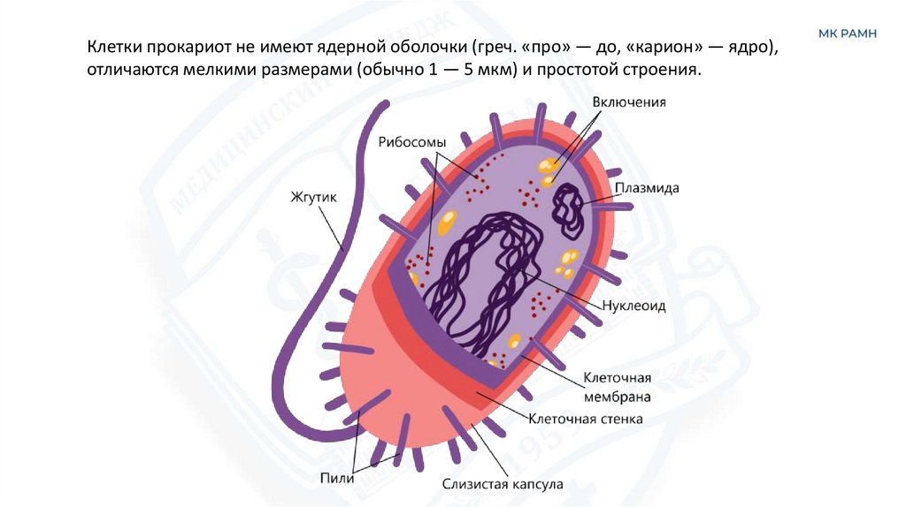 Клетки прокариот не имеют ядерной оболочки (греч. «про» — до, «карион» — ядро),отличаются мелкими размерами (обычно 1 — 5 мкм) и простотой строения.