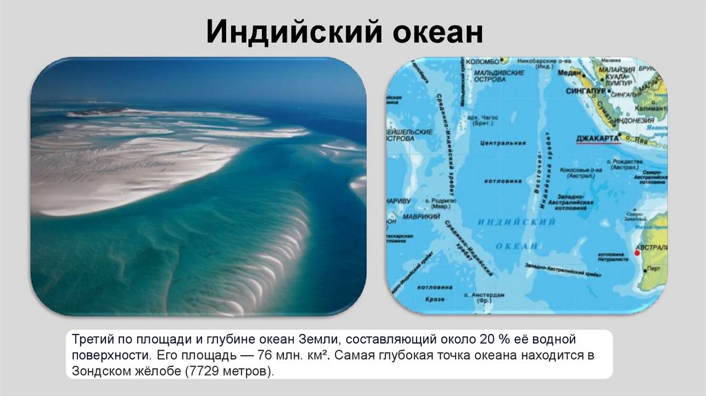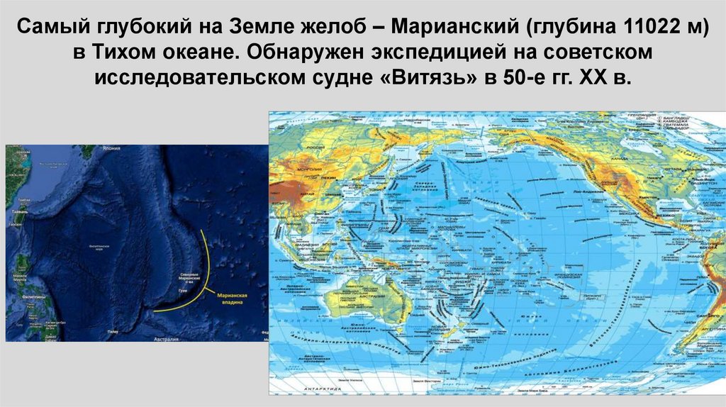 Самый глубокий на Земле желоб – Марианский (глубина 11022 м)в Тихом океане. Обнаружен экспедицией на советском