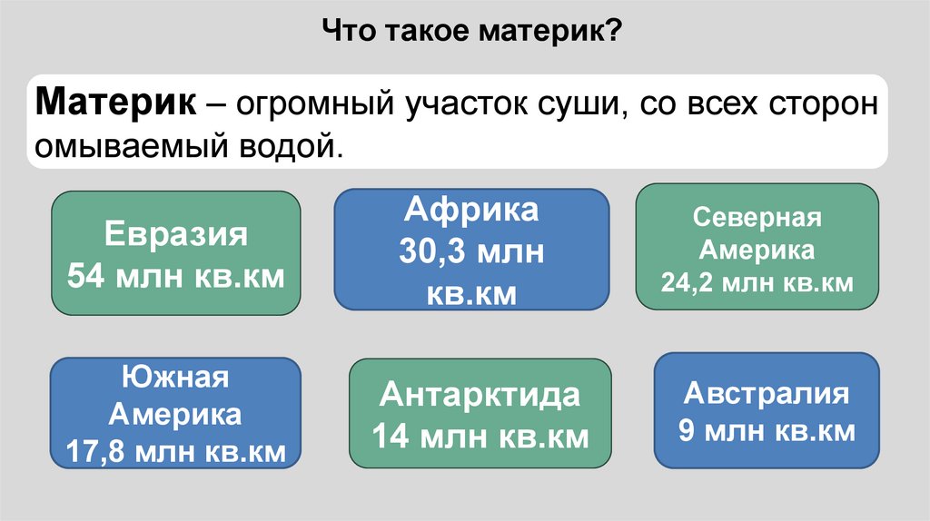 Что такое материк?Материк – огромный участок суши, со всех сторон