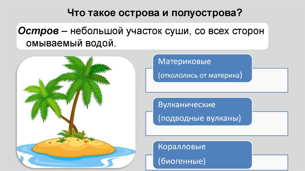 Что такое острова и полуострова?Остров – небольшой участок суши, со всех сторон