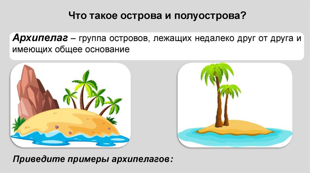 Что такое острова и полуострова?Архипелаг – группа островов, лежащих недалеко друг от друга и