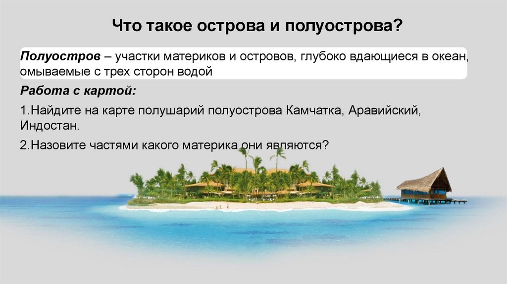 Что такое острова и полуострова?Полуостров – участки материков и островов, глубоко вдающиеся в океан,