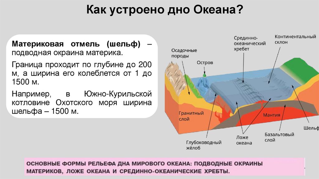 Как устроено дно Океана?Материковая отмель (шельф) –