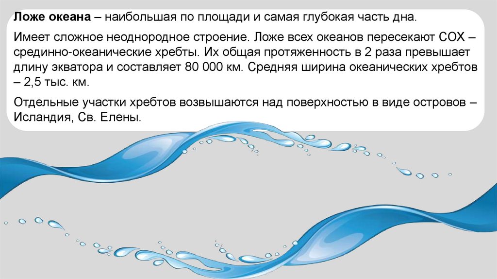 Ложе океана – наибольшая по площади и самая глубокая часть дна.Имеет сложное неоднородное строение. Ложе всех океанов пересекают СОХ –
