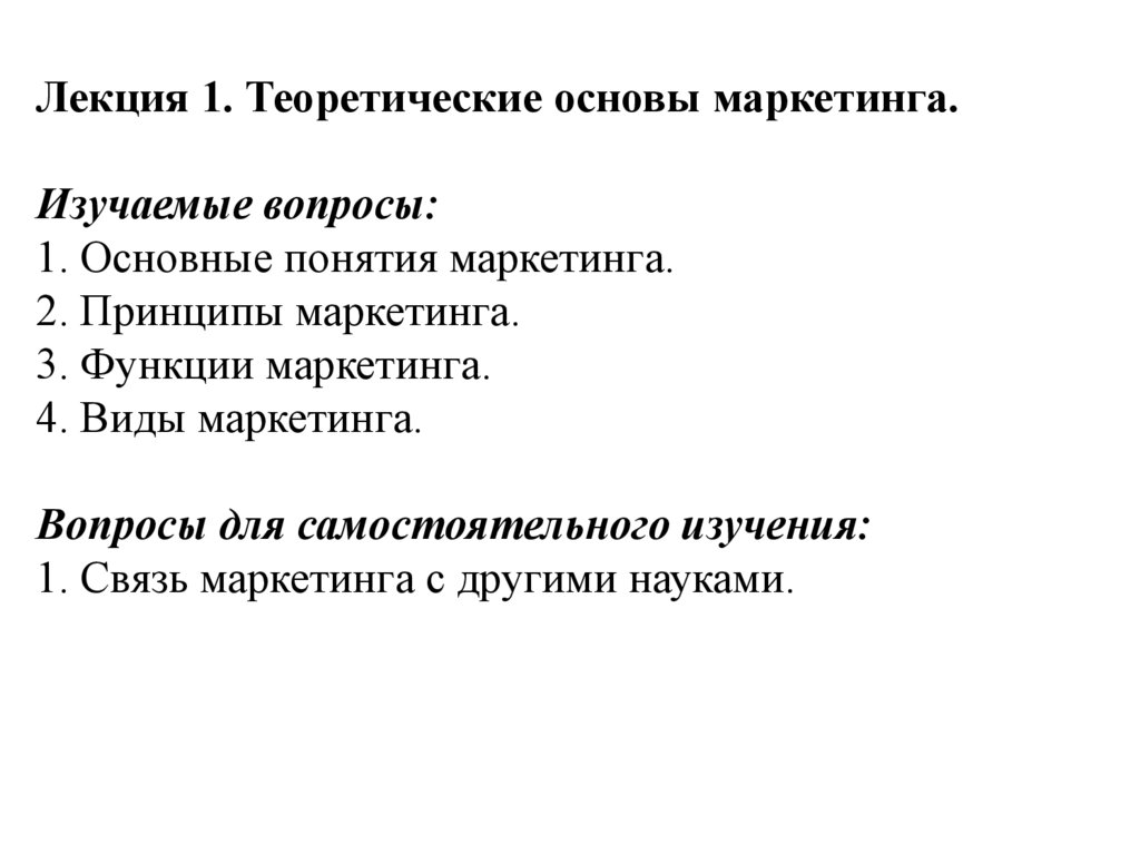 Лекция 1. Теоретические основы маркетинга.Изучаемые вопросы: