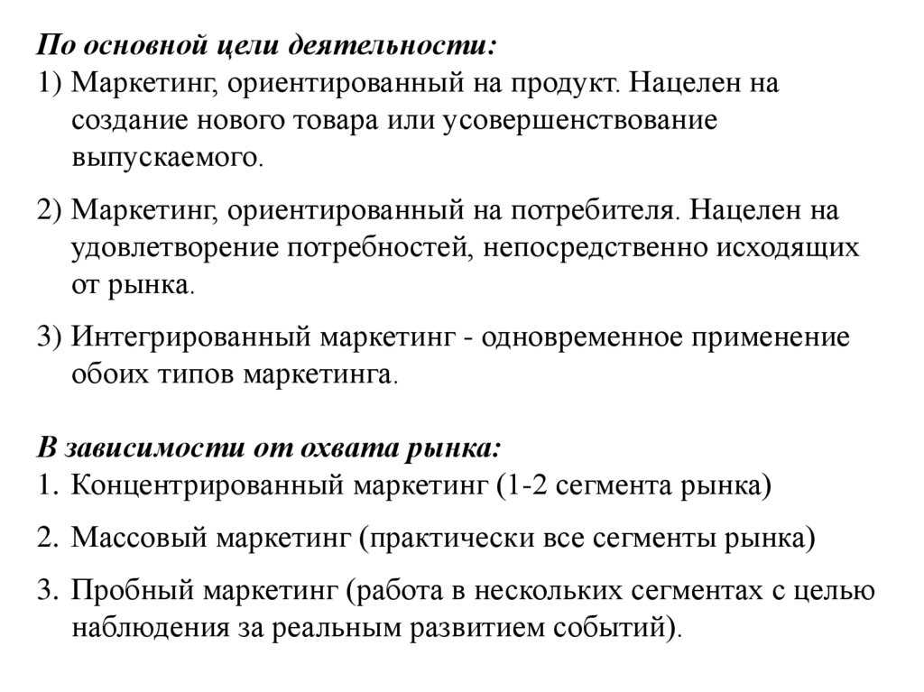 По основной цели деятельности:1) Маркетинг, ориентированный на продукт. Нацелен на