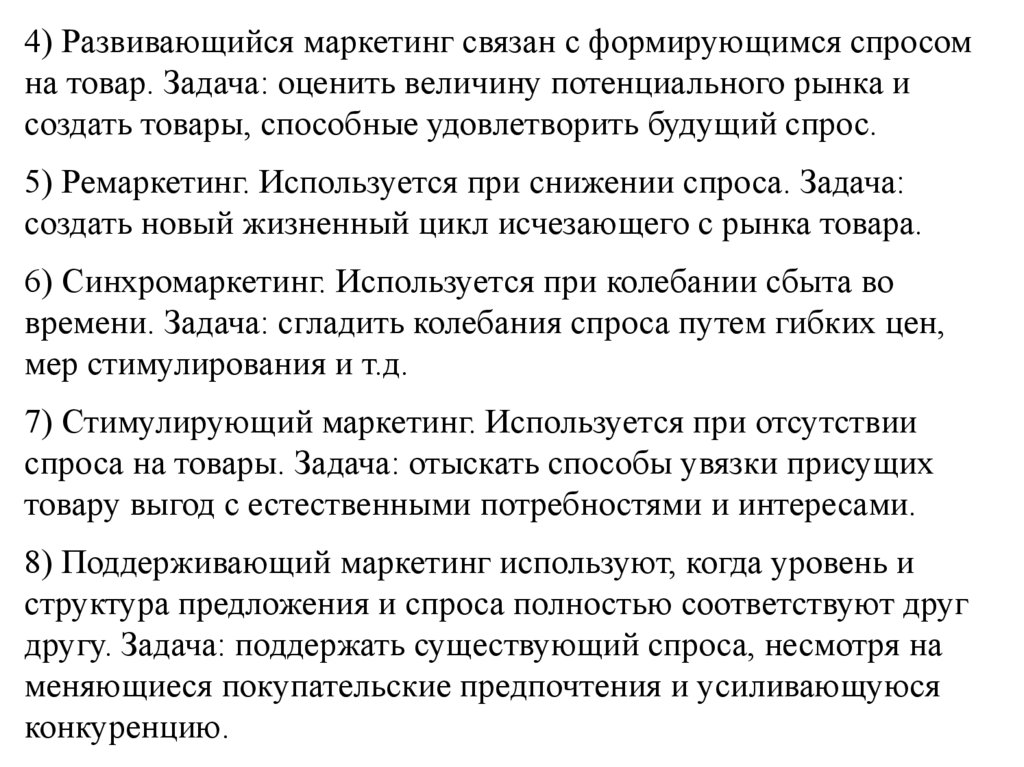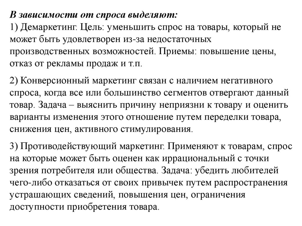 В зависимости от спроса выделяют:1) Демаркетинг. Цель: уменьшить спрос на товары, который не