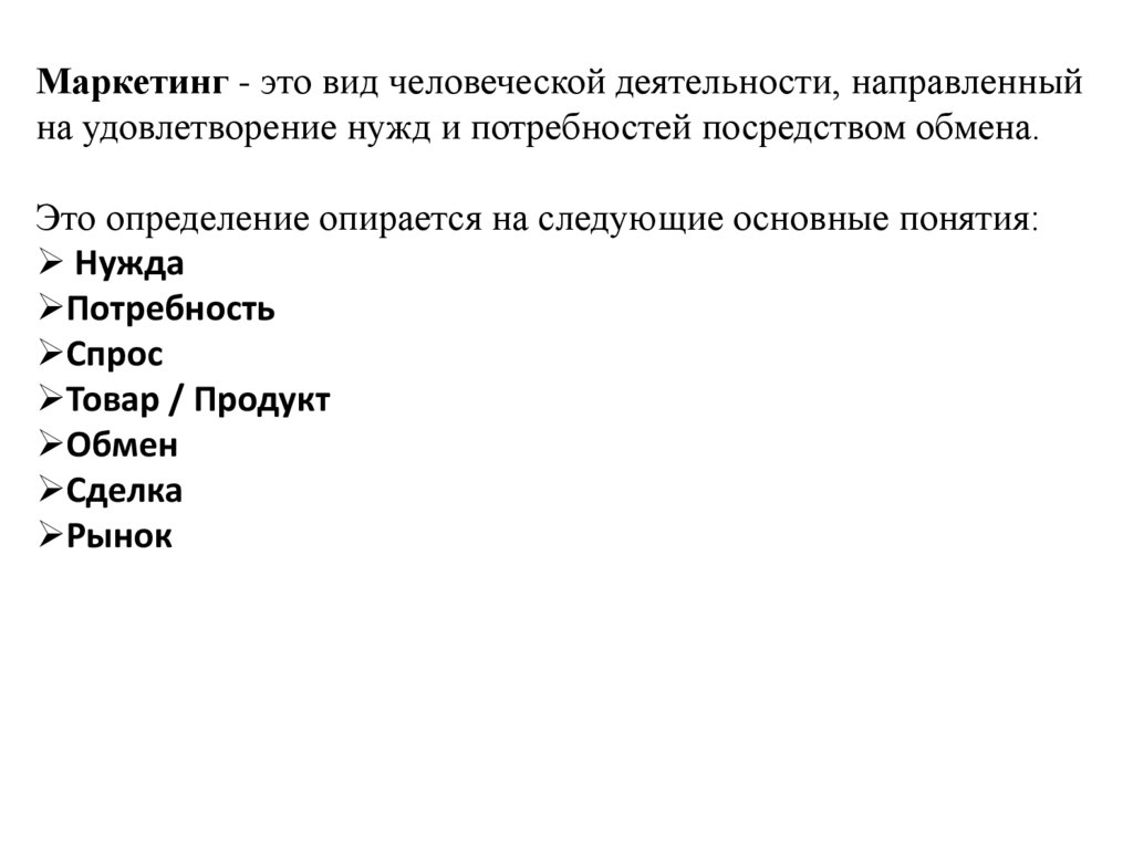 Маркетинг - это вид человеческой деятельности, направленныйна удовлетворение нужд и потребностей посредством обмена.