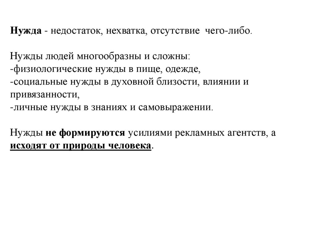 Нужда - недостаток, нехватка, отсутствие чего-либо.Нужды людей многообразны и сложны:
