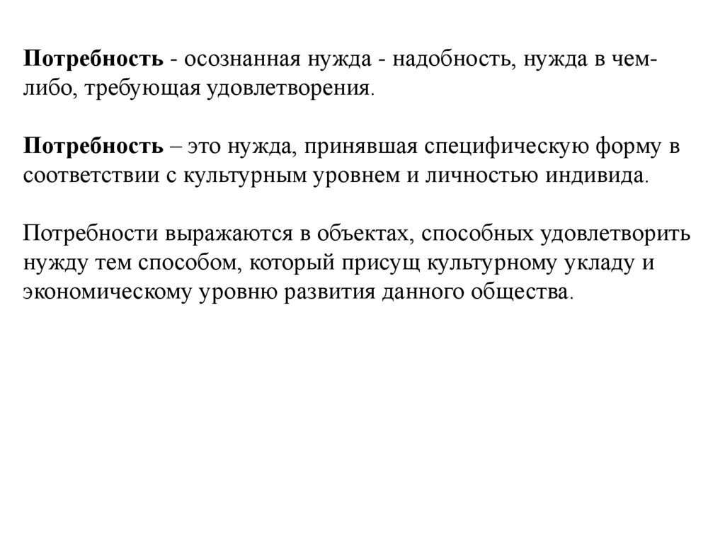 Потребность - осознанная нужда - надобность, нужда в чемлибо, требующая удовлетворения.Потребность – это нужда, принявшая специфическую форму в