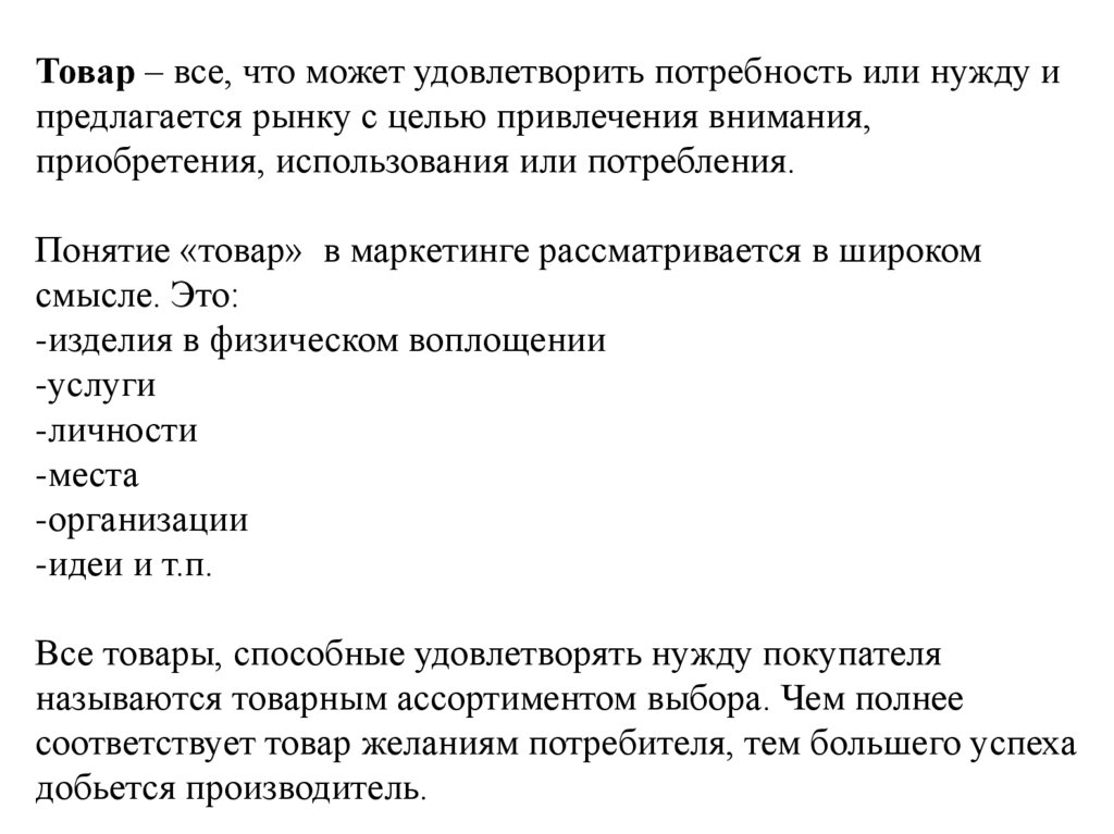 Товар – все, что может удовлетворить потребность или нужду ипредлагается рынку с целью привлечения внимания,