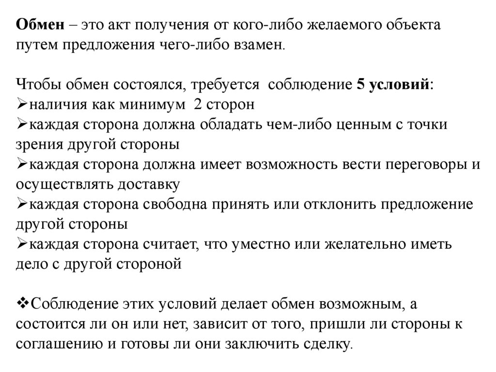 Обмен – это акт получения от кого-либо желаемого объектапутем предложения чего-либо взамен.