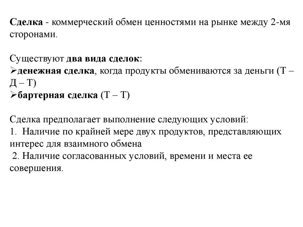 Сделка - коммерческий обмен ценностями на рынке между 2-мясторонами.