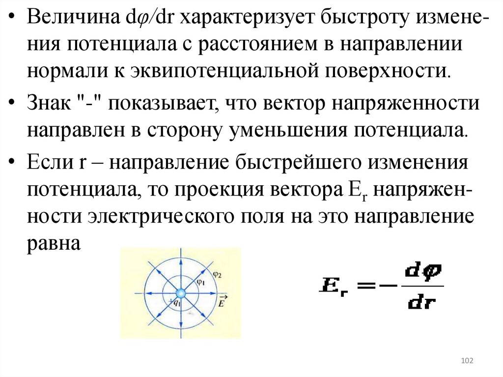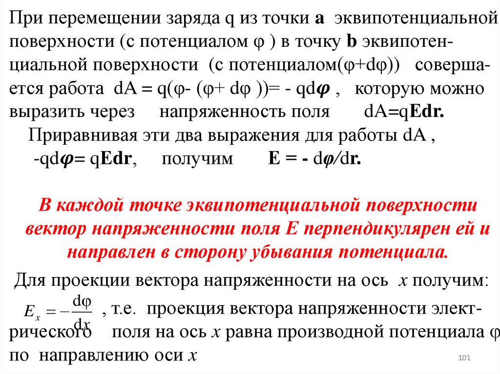 При перемещении заряда q из точки a эквипотенциальнойповерхности (с потенциалом φ ) в точку b эквипотенциальной поверхности (с потенциалом(φ+dφ)) совершается работа dA = q(φ- (φ+ dφ ))= - qd