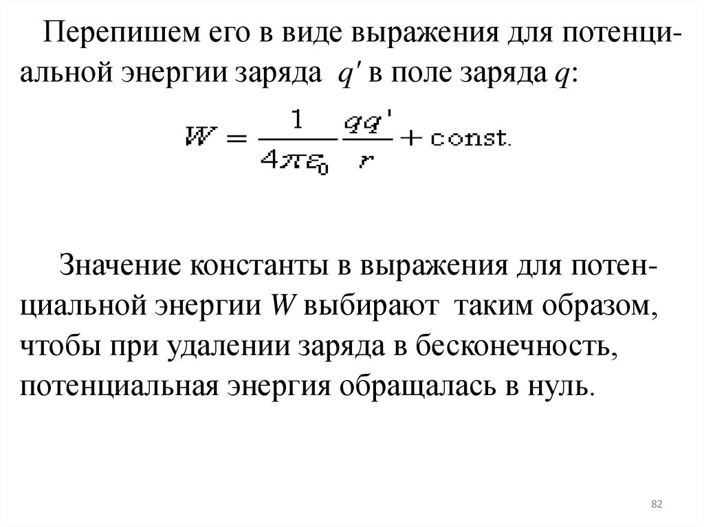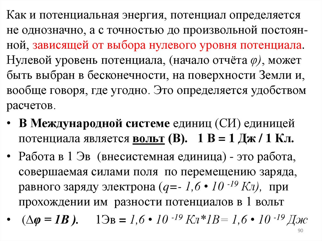 Как и потенциальная энергия, потенциал определяетсяне однозначно, а с точностью до произвольной постоянной, зависящей от выбора нулевого уровня потенциала.