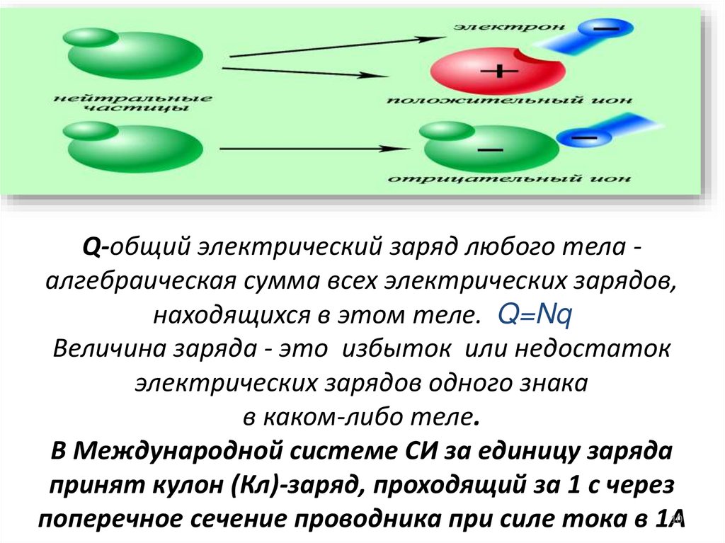 Q-общий электрический заряд любого тела алгебраическая сумма всех электрических зарядов,находящихся в этом теле. Q=Nq